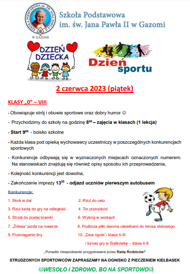 Zapraszamy uczniów i rodziców naszej szkoły na Dzień Dziecka i Sportu, już w ten piątek tj. 2.06.2023 na boisku szkolnym :)
