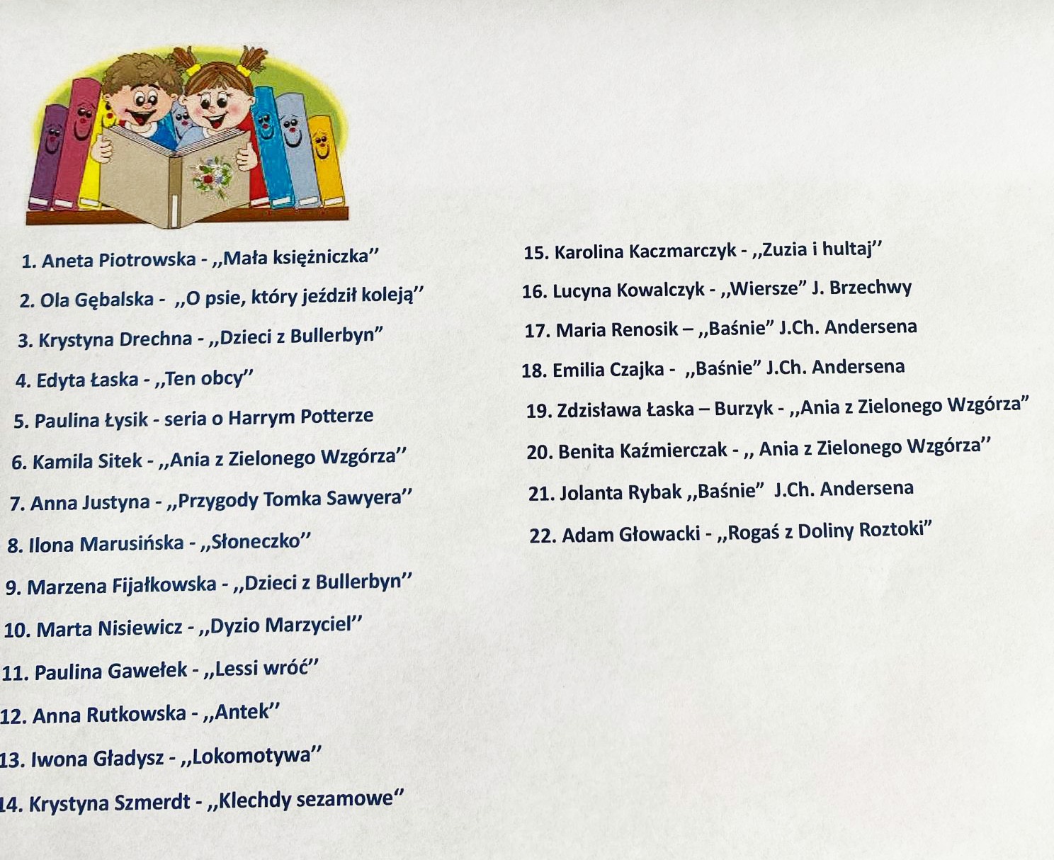 i Magdalena Staniaszek (kl.V) – to uczniowie nagrodzeni w konkursie plastycznym na okładkę ulubionej książki. Uczestnicy konkursu wykazali się niezwykłą pomysłowością w technikach wykonania prac. Wyróżnienia otrzymali: Róża Ruszkiewicz, Weronika Szewczyk, Miłosz i Mateusz Królikowscy, Maja Andrzejewska. Nagrody i wyróżnienia ufundował Samorząd Uczniowski.