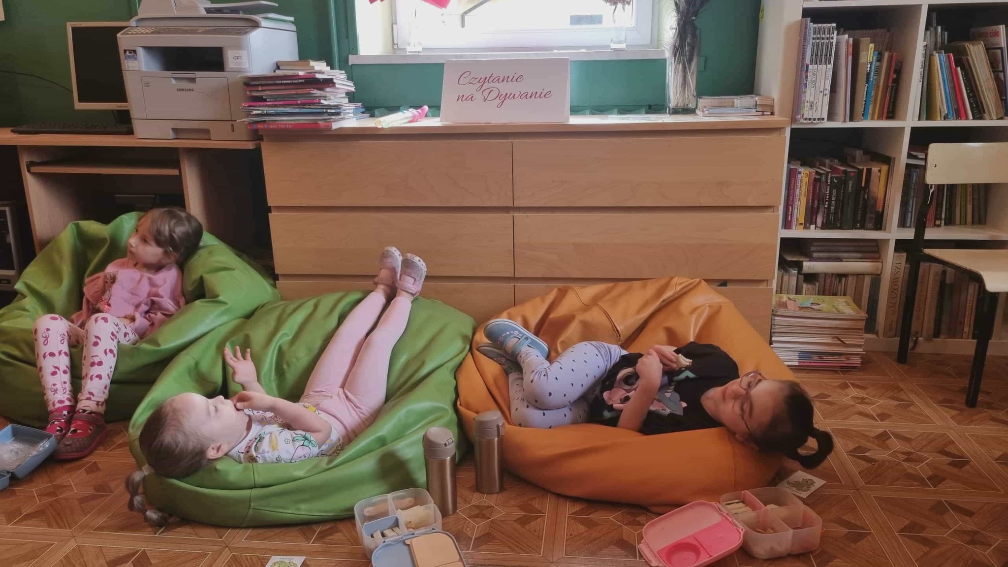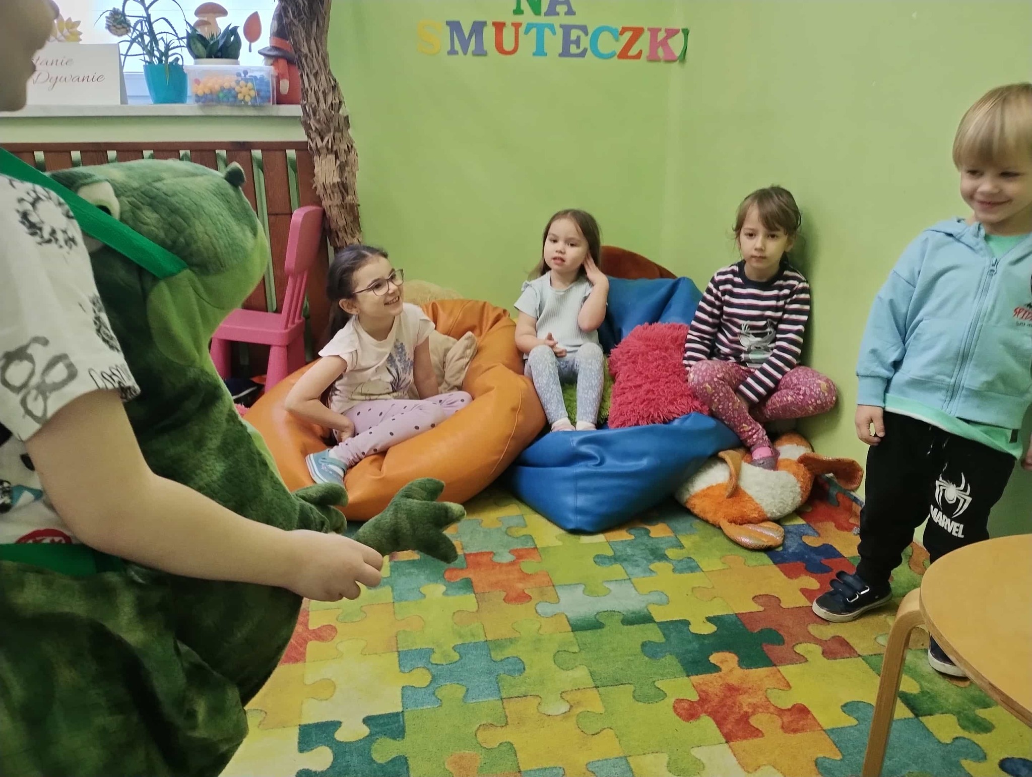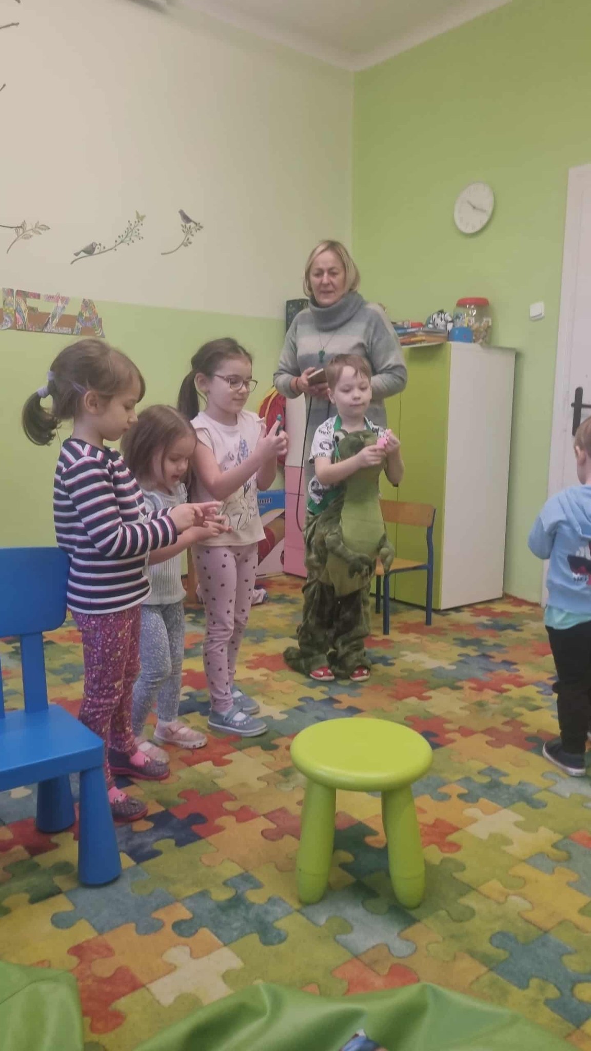 W szkolnej bibliotece trwa cykl spotkań „Czytanie na dywanie”. Tym razem gośćmi byli uczniowie z oddziału przedszkolnego, a motywem przewodnim -  smoki! 🐉🐲Po wysłuchaniu książki „Sceny z życia smoków”, którą przeczytała pani bibliotekarka, rozpoczęło się prawdziwe smocze szaleństwo. Były scenki z ich życia, smocze bańki, zawody „który smok poleci najdalej”, a nawet spotkanie ze smokiem Antonim, który przyjmował nowych towarzyszy do smoczej drużyny. Było radośnie, twórczo i odrobinę sportowo - czyli tak, jak smoki lubią najbardziej 🙂 📚📖