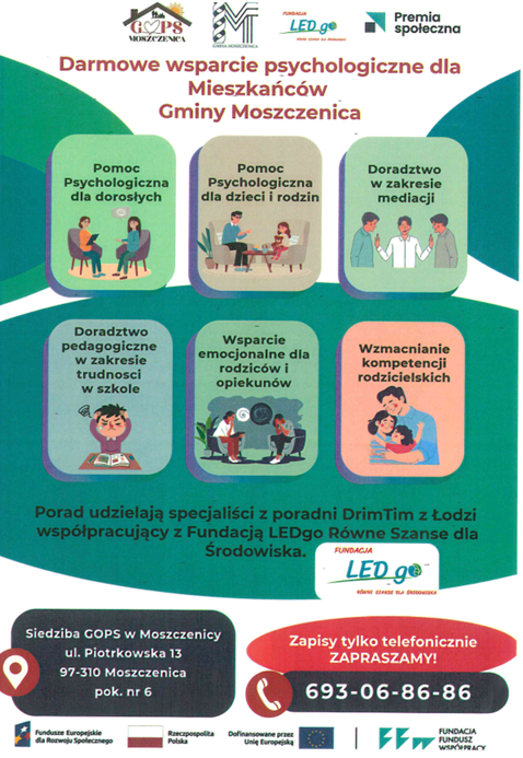 Bezpłatna Pomoc Psychologiczna dla dzieci i dorosłych mieszkańców gminy Moszczenica.