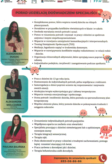 Program oferuje darmowe spotkania z doświadczonymi specjalistami z zakresu psychologii, pedagogiki i mediacji. W załączeniu znajdują się szczegółowe informacje i przybliżone sylwetki specjalistów do których możecie się Państwo umówić. Spotkania ze specjalistami są całkowicie poufne, zapisy prowadzi fundacja LEDgo z Tuszyna. Harmonogram spotkań dostępny na stronie Facebook GOPS w Moszczenicy lub pod nr telefonu 693 06 86 86.