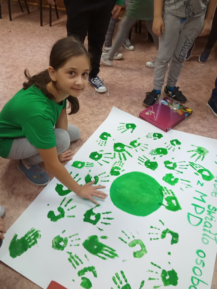 Zakończeniem lekcji była wspólna praca plastyczna dzieci „Dajmy zielone światło osobom z Mózgowym Porażeniem Dziecięcym”.