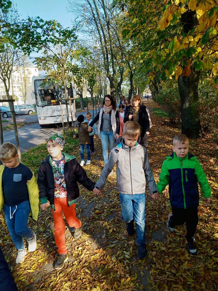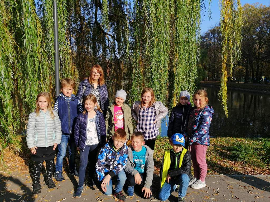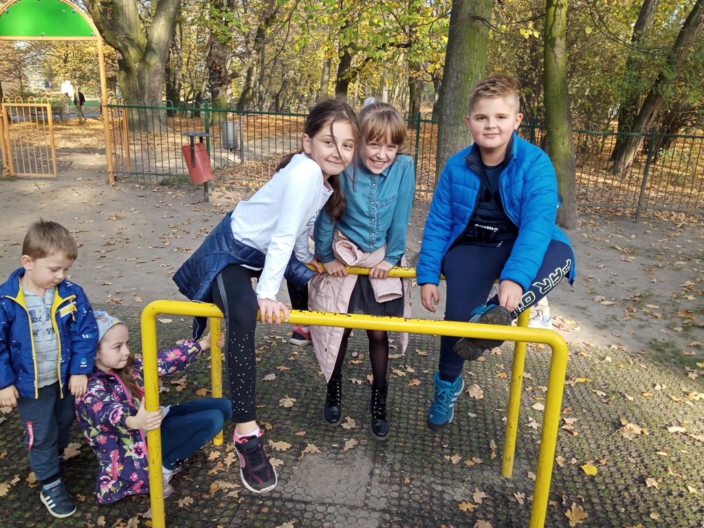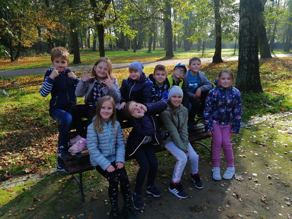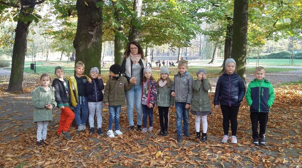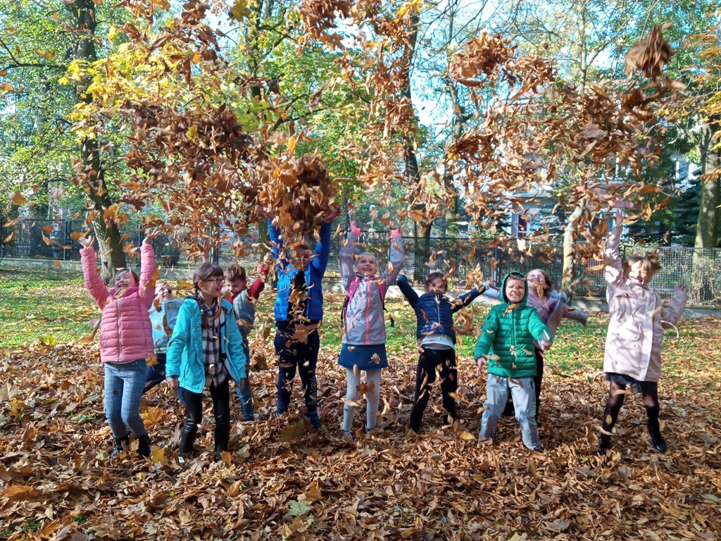 Po spektaklu wszyscy udali się na spacer do parku im. ks. Józefa Poniatowskiego. Jesienna sceneria zachwycała swoim pięknem i różnorodnością barw. Uczniowie świetnie bawili się w stosach liści leżących pod drzewami oraz na placu zabaw znajdującym się na terenie parku.