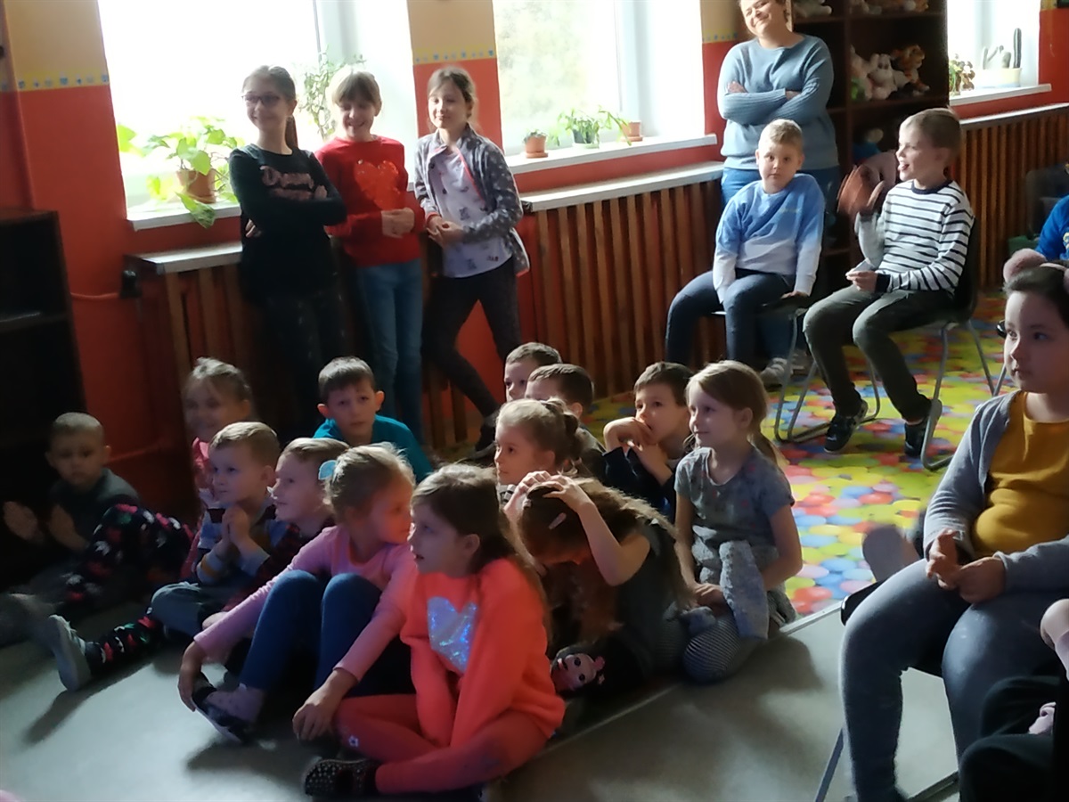 W szkolnej bibliotece trwa cykl spotkań „Czytanie na dywanie”. Tym razem gośćmi byli uczniowie z oddziału przedszkolnego, a motywem przewodnim -  smoki! 🐉🐲Po wysłuchaniu książki „Sceny z życia smoków”, którą przeczytała pani bibliotekarka, rozpoczęło się prawdziwe smocze szaleństwo. Były scenki z ich życia, smocze bańki, zawody „który smok poleci najdalej”, a nawet spotkanie ze smokiem Antonim, który przyjmował nowych towarzyszy do smoczej drużyny. Było radośnie, twórczo i odrobinę sportowo - czyli tak, jak smoki lubią najbardziej 🙂 📚📖