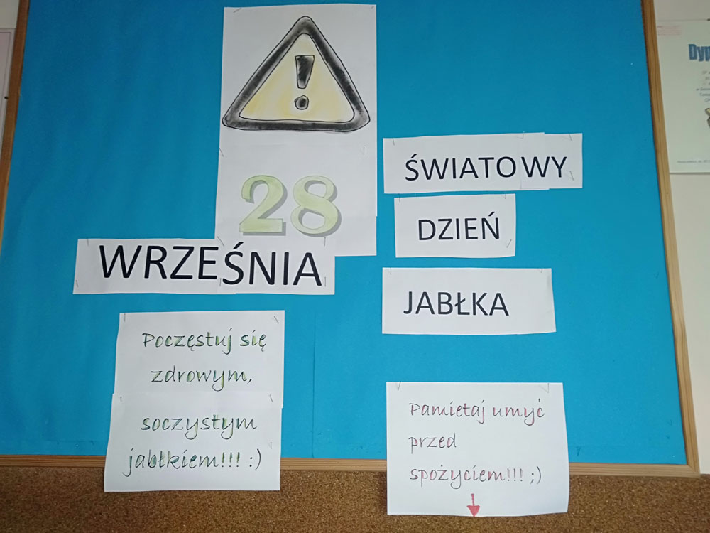 W dniu 28 września obchodziliśmy ŚWIATOWY DZIEŃ JABŁKA . Wiemy jak zdrowe są jabłka , dlatego w tym dniu Samorząd Uczniowski zakupił 6kg jabłek ,aby uczniowie mogli się nimi poczęstować;)